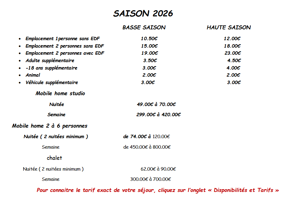 En juillet et août les réservations – Chalets et Mobil-homes – s’entendent à la semaine du samedi 16H au samedi 12H.